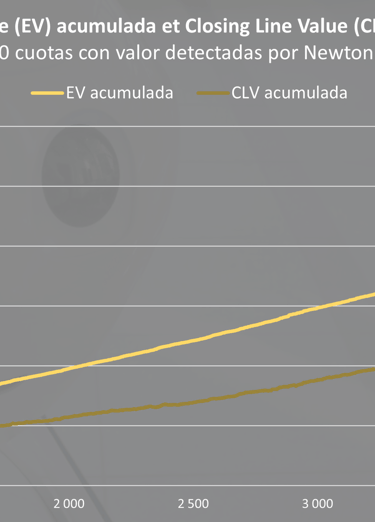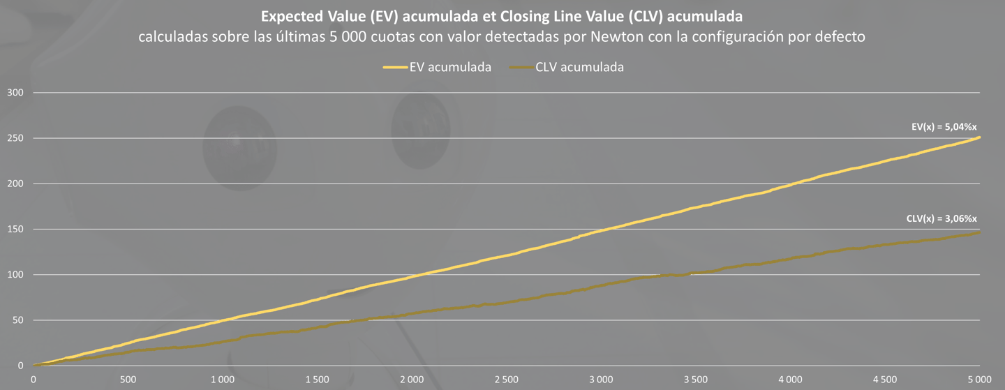 Esta CLV, más que la EV, permite medir la rentabilidad teórica de una apuesta con varianza nula. A continuación, encontrarás un gráfico que representa la EV y la CLV generadas en las últimas 5 000 cuotas con valor detectadas por Newton, que corresponden al volumen mensual medio de la suscripción Diamond con una configuración por defecto.