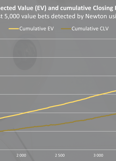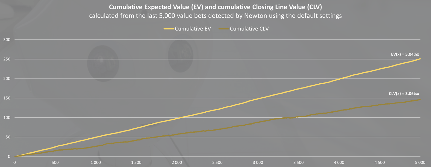 More than EV, this CLV makes it possible to measure the theoretical profitability of a bet, assuming zero variance. Below, you’ll find a chart showing the EV and CLV generated from the last 5,000 value bets detected by Newton — the average monthly volume of the Diamond subscription — based on the default settings.